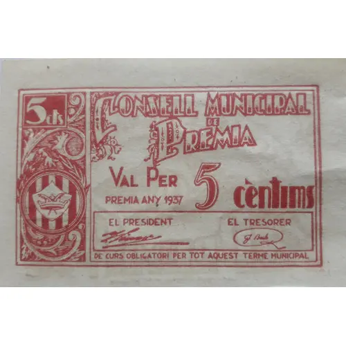| Obverse lettering | 5 cts. CONSELL MUNICIPAL DE PREMIA Val per 5 cèntims PREMIA ANY 1937 DE CURS OBLIGATORI PER TOT AQUEST TERME MUNICIPAL (Translation: 5 Centimos Municipal Council of Premià Valid for 5 Centimos Premià year 1937 Of mandatory course for all this Municipal term) |
