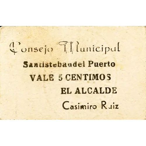 Consejo Municipal Santisteban del Puerto VALE 5 CENTIMOS EL ALCALDE Casimiro Ruiz (Translation: Municipal Council Santisteban del Puerto It is worth 5 Centimos The Mayor) |
