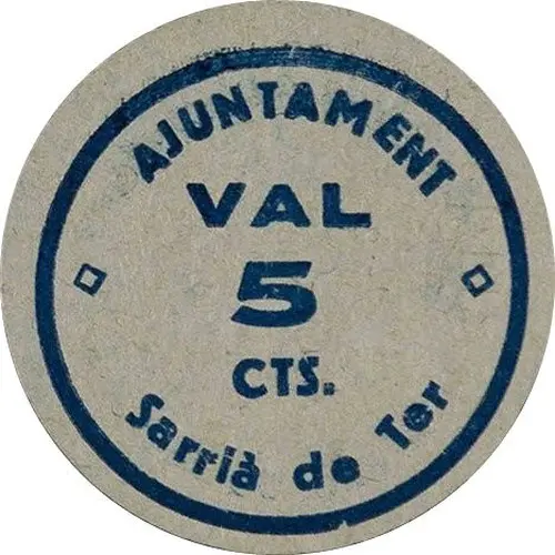 | Obverse lettering | AJUNTAMENT Sarrià de Ter VAL 5 CTS. (Translation: City Council Sarrià de Ter Voucher 5 Centimos) |