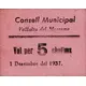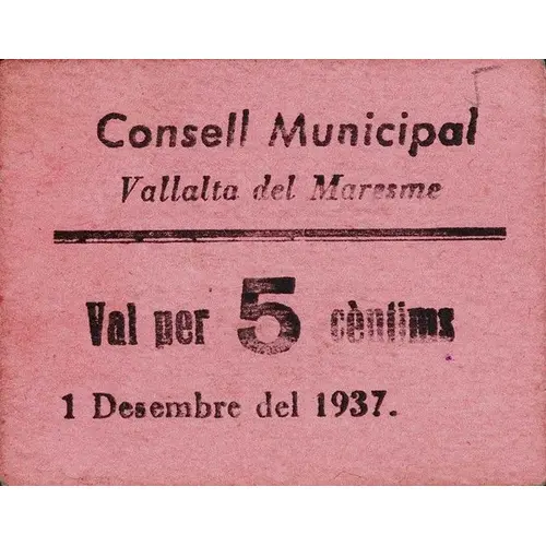 Consell Municipal Vallalta del Maresme Val per 5 cèntims 1 Desembre del 1937. (Translation: Municipal Council Vallalta del Maresme Voucher for 5 Centimos December 1, 1937.) |