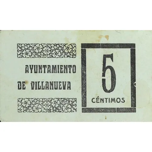 | Ön yüz lejandı | AYUNTAMIENTO DE VILLANUEVA 5 CÉNTIMOS (Translation: City Council of Villanueva 5 Centimos) |