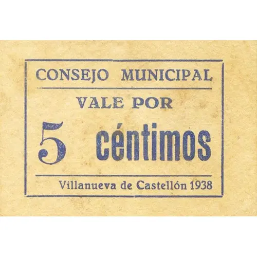 | 正面铭文 | CONSEJO MUNICIPAL VALE POR 5 céntimos Villanueva de Castellón 1938 (Translation: Municipal Council Valid for 5 Centimos Villanueva de Castellón 1938) |