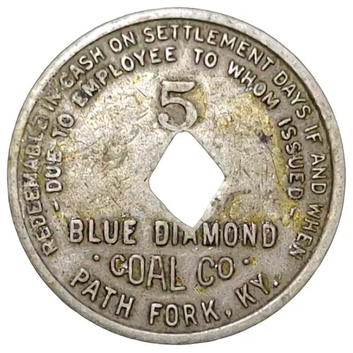 | Opis líce | REDEEMABLE IN CASH ON SETTLEMENT DAYS IF AND WHEN DUE TO EMPLOYEE TO WHOM ISSUED 5 BLUE DIAMOND COAL CO. PATH FORK, KY. |