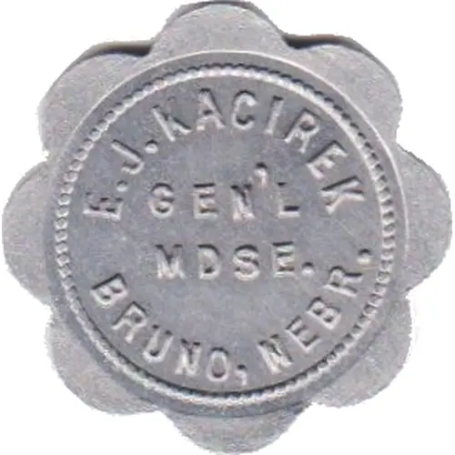 | Obverse lettering | E.J. KACIREK GEN`L MDSE. BRUNO, NEBR. |