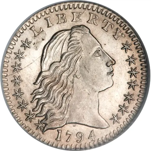 The `Flowing Hair` Liberty head on the right, the thirteen stars of the original union and the vintage. This design was not well accepted by the public, as the flowing hair was considered daring for the time. |