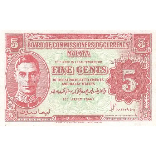 | Obverse lettering | Board of Commissioners of Currency Malaya This Note is Legal Tender for Five Cents in the Straits Settlements and Malay States |