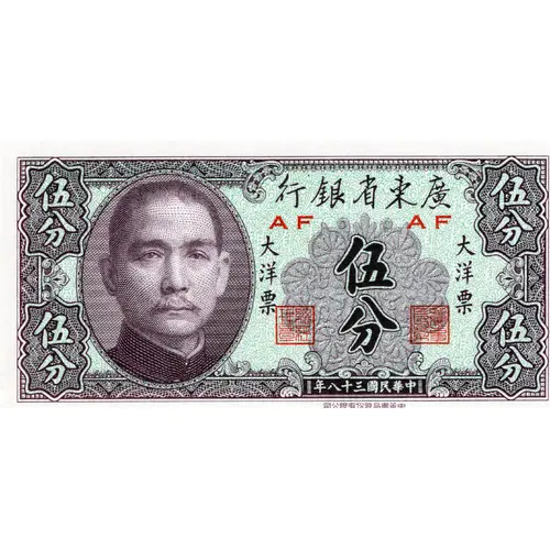 | Obverse description | Purple on green underprint. Sun Yat Sen left. Red plate letters and seals. |