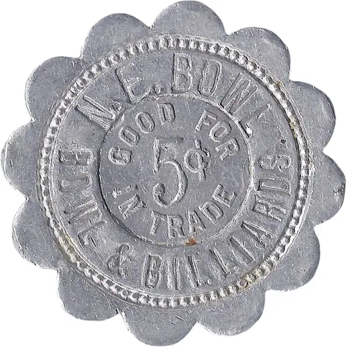 Obverse lettering N.E. BOWL GOOD FOR 5¢ IN TRADE BOWL & BILLIARDS