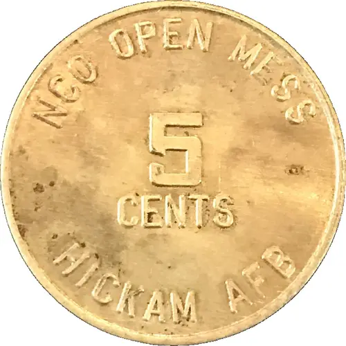 | Obverse lettering | NCO OPEN MESS 5 CENTS HICKAM AFB |