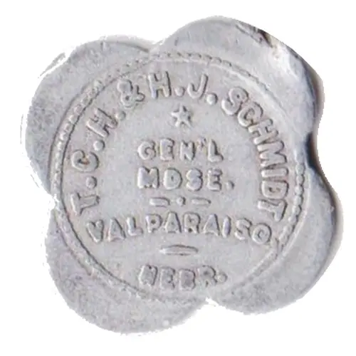 | نوشتههای روی توکن | T.C.H. & H.J. SCHMIDT GEN`L MDSE. VALPARAISO, NEBR. |