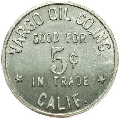 | Obverse lettering | VARGO OIL CO., INC. GOOD FOR 5¢ ⋆ IN TRADE ⋆ CALIF. |