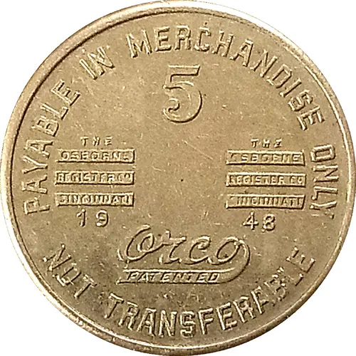 | Obverse lettering | PAYABLE IN MERCHANDISE ONLY 5 THE OSBORNE REGISTER Co. CINCINNATI THE OSBORNE REGISTER Co. CINCINNATI ORCO PATENTED NOT TRANSFERABLE 1948 Orco PATENTED NOT TRANSFERABLE |