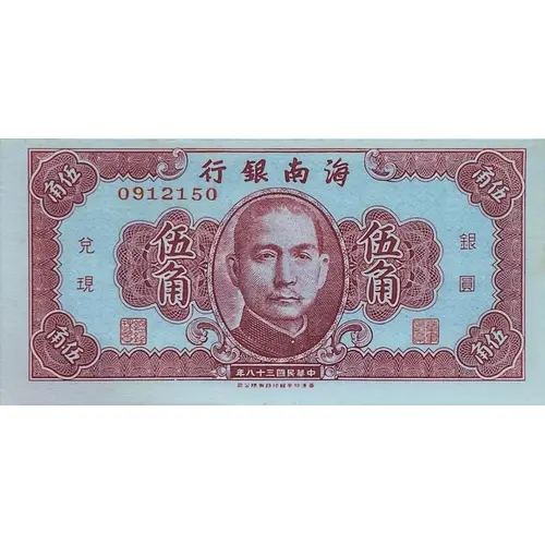 海南銀行 伍角 兌現銀圓 中華民國三十八年 香港印字館印務有限公司 (Translation: Hainan Bank 5 Chiao (= 50 Cents) Cash in silver dollar 38th years of the Republic of China Hong Kong Painting Press Ltd.) |