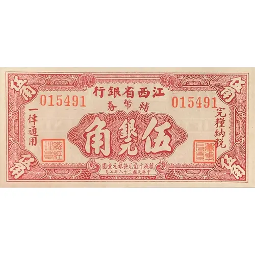 | Obverse lettering | 江西省銀行 輔幣券 伍角銀元 積成十角兌換銀元壹圓 中華民國三十八年七月 完糧納稅 一律通用 (Translation: Jiangxi Provincial Bank Currency coupon 5 chiao (50 cents) silver dollar Accumulate 10 chiao for exchange one silver dollar July, the 38th year of the Republic of China Good for using to pay taxes as well) |