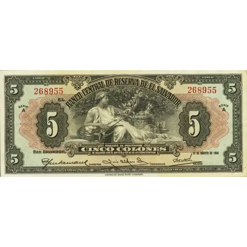 | نوشتههای روی اسکناس | BANCO CENTRAL DE RESERVA DE EL EL SALVADOR PAGARA AL PORTADOR CINCO COLONES DE ACUERDO CON EL ARTICULO 39 DE SU LEY CONSTITUTIVA SAN SALVADOR 31 DE AGOSTO DE 1934. (Translation: Central Reserve Bank of El Salvador Pay to Bearer Five Colons in according with article 39 of Constitutional Law San Salvador, August 31, 1934.) |