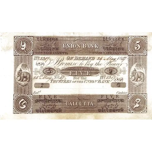 | Obverse lettering | UNION BANK UNION BANK, CALCUTTA ON DEMAND 25 May 1847 Promise to pay the Bearer Company Rupees Five for the Trustees of the Union Bank |