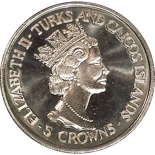 | Obverse lettering | ELIZABETH II · TURKS AND CAICOS ISLANDS - 5 CROWNS - |