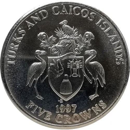 | Obverse lettering | TURKS AND CAICOS ISLANDS LB 1997 FIVE CROWNS |