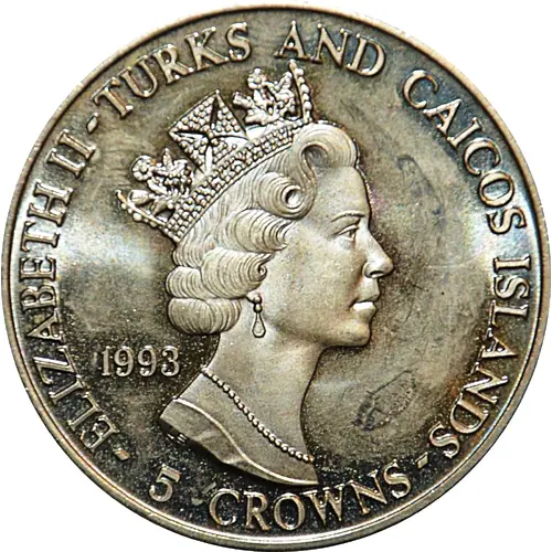 | Obverse lettering | ELIZABETH II - TURKS AND CAICOS ISLANDS 1993 - 5 CROWNS - |