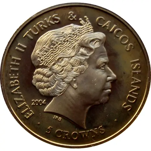 | Obverse lettering | ELIZABETH II TURKS & CAICOS ISLANDS 2004 IRB 5 CROWNS |