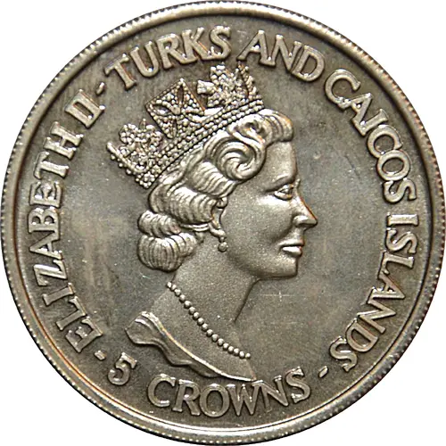 | Obverse lettering | ELIZABETH II-TURKS AND CAICOS ISLANDS -5 CROWNS- |