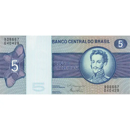 | Obverse lettering | BANCO CENTRAL DO BRASIL 5 5 CINCO CRUZEIROS D. PEDRO I 5 PRESIDENTE CONSELHO MONETÁRIO PRESIDENTE BANCO CENTRAL (Translation: Central Bank of Brazil 5 Five Cruzeiros D. Pedro I 5 President Monetary Council President Central Bank) |