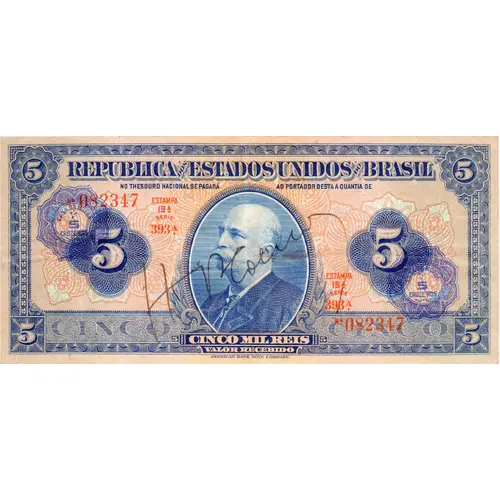 | Obverse lettering | 5 5 REPUBLICA DOS ESTADOS UNIDOS DO BRASIL NO THESOURO NACIONAL SE PAGARÁ AO PORTADOR DESTA A QUANTIA DE 5 5 CASA DA MOEDA 5 CRUZEIROS CASA DA MOEDA 5 CRUZEIROS CINCO 5 CINCO MIL REIS 5 CINCO VALOR RECEBIDO 5 5 AMERICAN BANK NOTE COMPANY. (Translation: Republic of the United States of Brazil In the National Treasury will be paid to the holder of this amount of Five Five Thousand Réis Five Mint 5 Cruzeiros Amount Received American Bank Note Company.) |
