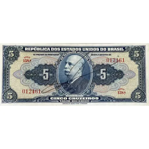 | Obverse lettering | REPÚBLICA DOS ESTADOS ESTADOS UNIDOS DO BRASIL SE PAGARÁ AO PORTADOR DESTA A QUANTIA DE CINCO CRUZEIROS 5 NO TESOURO NACIONAL 5 BARÃO DO RIO BRANCO VALOR RECEBIDO AMERICAN BANK NOTE COMPANY. (Translation: Republic of United States of Brazil will be paid to the carrier of this amount of Five Cruzeiros in the National Treasury Baron of Rio Branco Amount Received American Bank Note Company.) |