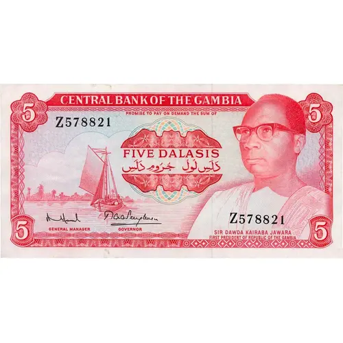 | Obverse lettering | CENTRAL BANK OF THE GAMBIA PROMISE TO PAY ON DEMAND THE SUM OF FIVE DALASIS GENERAL MANAGER GOVERNOR SIR DAWDA KAIRABA JAWARA FIRST PRESIDENT OF REPUBLIC OF THE GAMBIA |