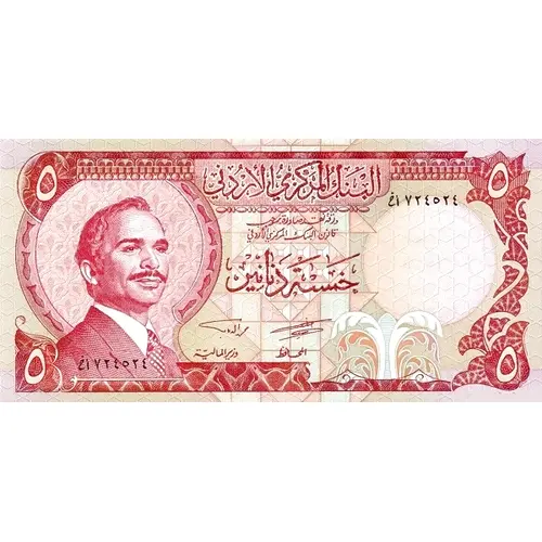 | Obverse lettering | البنك المركزي الأردني ورقة نقد صادرة بموجب قانون البنك المركزي الأردني خمسة دنانير المحافظ - وزير المالية (Translation: Central Bank of Jordan A banknote issued according to the law of the Central Bank of Jordan Five Dinars Governor - Minister of Finance) |