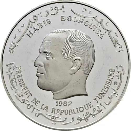 | Averslegende | HABIB BOURGUIBA 1982 PRESIDENT DE LA REPUBLIQUE TUNISIENNE رئيس الجمهورية التونسية (Translation: Habib Bourguiba 1982 President of the Tunisian Republic) |