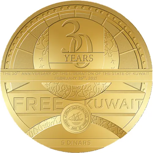 表面の銘文 30 YEARS THE 30TH ANNIVERSARY OF THE LIBERATION OF THE STATE OF KUWAIT FEBRUARY 26TH, 2021 FREE KUWAIT 5 DINARS
