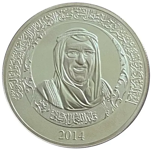 | Obverse lettering | إصدَار تذكَارِي بِتسْميَة حَضرَة صاحب السُمُو الشيخ صَبَاح الأَحمد الجَابِر الصَبَاح أمير دَولة الكُويت قَائِداً للعملِ الإنساني 2014 (Translation: Commemorative issue for the naming of His Highness Sheikh Sabah Al-Ahmad Al-Jaber Al-Sabah, Emir of the State of Kuwait Leader of humanitarian work 2014) |