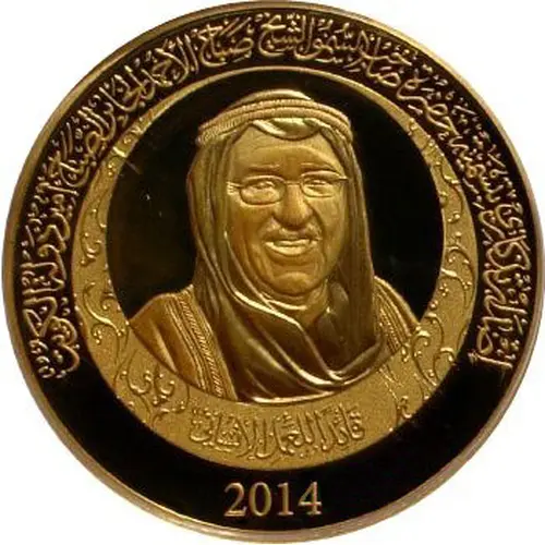 | Obverse lettering | إصدَار تذكَارِي بِتسْميَة حَضرَة صاحب السُمُو الشيخ صَبَاح الأَحمد الجَابِر الصَبَاح أمير دَولة الكُويت قَائِداً للعملِ الإنساني 2014 (Translation: Commemorative issue for the naming of His Highness Sheikh Sabah Al-Ahmad Al-Jaber Al-Sabah, Emir of the State of Kuwait Leader of humanitarian work 2014) |