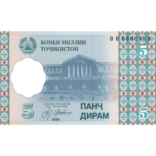 | نوشتههای روی اسکناس | БОНКИ МИЛЛИИ ТОҶИКИСТОН ПАНҶ ДИРАМ (Translation: National Bank of Tajikistan, Five Dirams) |