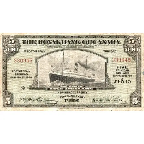 THE ROYAL BANK OF CANADA WILL PAY TO THE BEARER ON DEMAND AT PORT OF SPAIN TRINIDAD THE SUM OF FIVE DOLLARS IN TRINIDAD CURRENCY REDEEMABLE ONLY IN TRINIDAD PORT OF SPAIN TRINIDAD FIVE TRINIDAD DOLLARS THE EQUIVALENT OF £1-0-10 |