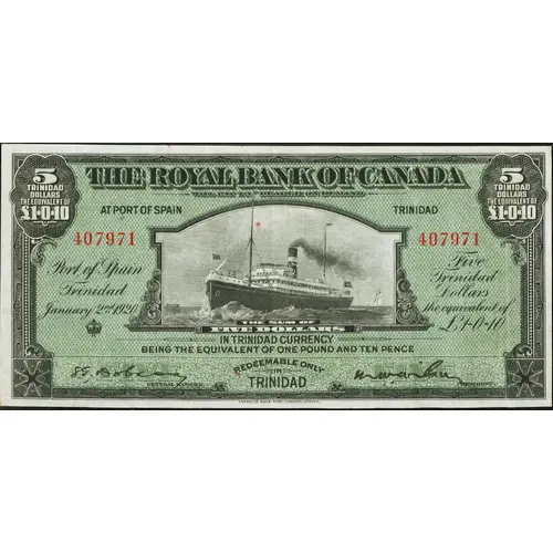 | Obverse lettering | THE ROYAL BANK OF CANADA WILL PAY TO THE BEARER ON DEMAND AT PORT OF SPAIN TRINIDAD THE SUM OF FIVE DOLLARS IN TRINIDAD CURRENCY REDEEMABLE ONLY IN TRINIDAD PORT OF SPAIN TRINIDAD FIVE TRINIDAD DOLLARS THE EQUIVALENT OF £1-0-10 |