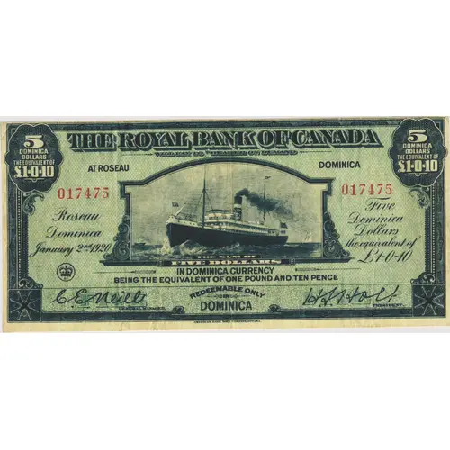 5 Dominica Dollars the Equivalent of £1-0-10 (upper left and upper right) The Royal Bank Of Canada Will Pay To Bearer On Demand The Sum Of Five Dollars in Dominica Currency Being the Equivalent of One Pound and Ten Pence At Roseau Dominica Roseau Dominica January 2nd 1920 (front left) Five Dominica Dollars the equivalent of £1-0-10 (front right side) Redeemable Only In Dominica E.C. Neill General Manager (left) H.S. Holt President (right) |