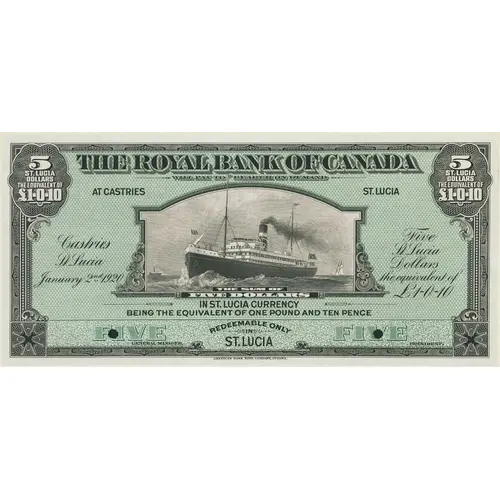 5 ST. LUCIA DOLLARS THE EQUIVALENT OF £1-0-10 THE ROYAL BANK OF CANADA WILL PAY TO THE BEARER ON DEMAND AT CASTRIES ST.LUCIA THE SUM OF FIVE DOLLARS IN ST.LUCIA CURRENCY BEING THE EQUIVALENT OF ONE POUND AND TEN PENCE Castries St. Lucia January 2nd 1920 Five St. Lucia Dollars the equivalent of £1-0-10 REDEEMABLE ONLY IN ST.LUCIA |