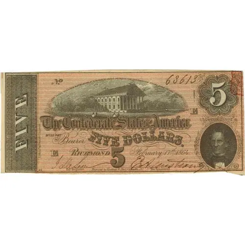 | Obverse lettering | Two years after the ratification of a Treaty of Peace between the Confederate States & the United States The Confederate States of America will pay to Bearer FIVE DOLLARS. Richmond 5 |