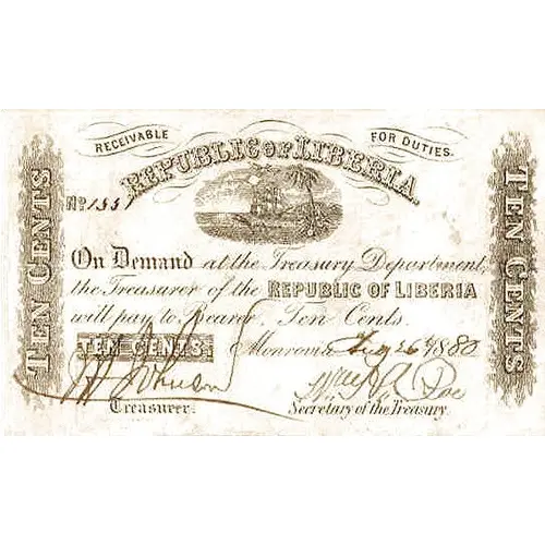 | نوشتههای روی اسکناس | REPUBLIC OF LIBERIA RECEIVABLE FOR DUTIES ON DEMAND AT THE TREASURY DEPARTMENT THE TREASURER OF THE REPUBLIC OF LIBERIA WILL PAY TO BEARER FIVE DOLLARS FIVE DOLLARS |