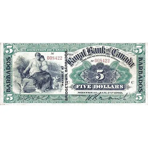 DOMINION OF CANADA THE Royal Bank of Canada WILL PAY TO BEARER ON DEMAND FIVE DOLLARS MONTREAL JAN 2nd, 1909. BARBADOS PAYABLE AT BRIDGETOWN BARBADOS 5 |
