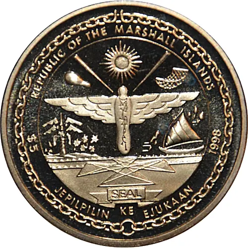 Opis líce REPUBLIC OF THE MARSHALL ISLANDS $5 1998 SEAL KE JEPILPILIN KE EJUKAAN
