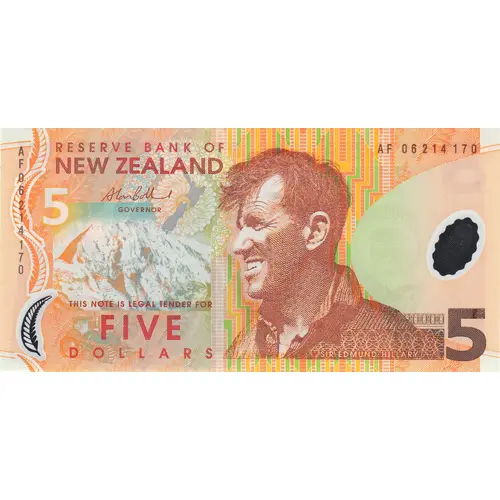 RESERVE BANK OF NEW ZEALAND THIS NOTE IS LEGAL TENDER FOR FIVE DOLLARS SIR EDMUND HILLARY |