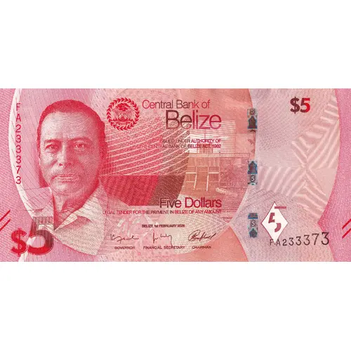 Central Bank of Belize ISSUED UNDER AUTHORITY OF THE CENTRAL BANK OF BELIZE ACT. 1982 Five Dollars LEGAL TENDER FOR THE PAYMENT IN BELIZE OF ANY AMOUNT BELIZE, 1st. FEBRUARY 2025 $5 |