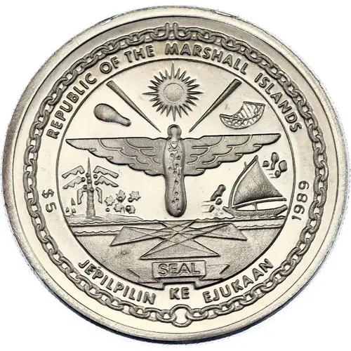 Historical Context: Issued in 1989, this Marshall Islands 5 Dollars coin commemorates the 20th anniversary of the Apollo 11 moon landing. As a newly independent sovereign nation since 1986, under a Compact of Free Association with the United States, the Marshall Islands frequently issued commemorative coinage. This "First Men on the Moon" theme held global historical significance, leveraging universal appeal and referencing the islands' historical ties to the US, a key space race participant.