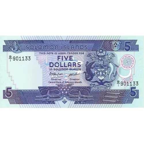 Chữ khắc mặt trước SOLOMON ISLANDS THIS NOTE IS LEGAL TENDER FOR FIVE DOLLARS IN SOLOMON ISLANDS CENTRAL BANK OF SOLOMON ISLANDS