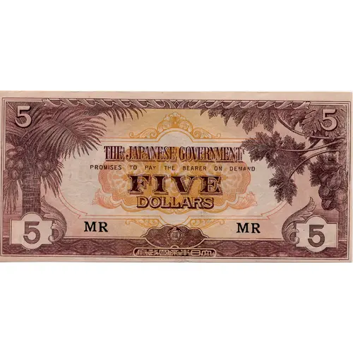 | Obverse lettering | THE JAPANESE GOVERNMENT PROMISES TO PAY THE BEARER ON DEMAND FIVE DOLLARS 府政國帝本日大 |