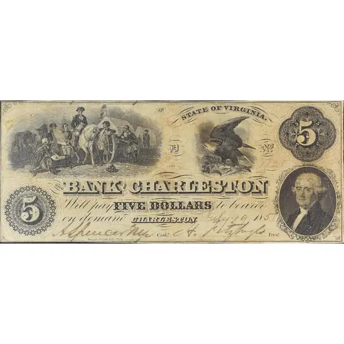 STATE OF VIRGINIA THE BANK OF CHARLESTON Will pay FIVE DOLLAR to bearer on demand CHARLESTON July 19, 1858 |