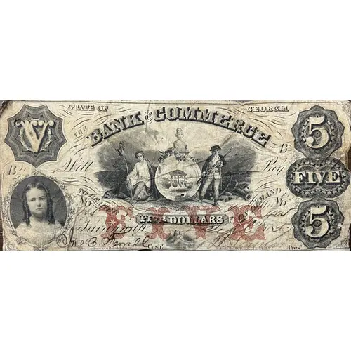 | Obverse lettering | STATE OF GEORGIA The Bank of Commerce Will Pay TO BEARER FIVE DOLLARS ON DEMAND Savannah 4 Sep 1857 Bald, Cousland & Co, Philadelphia Cash.ʳ Baldwin, Bald, Cousland, New York Pres.ᵗ |